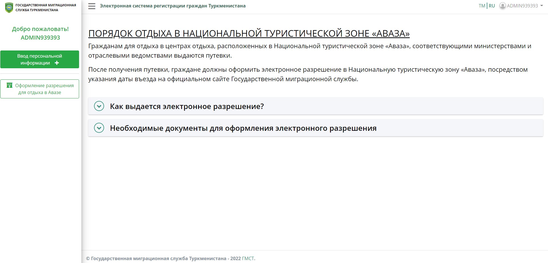 The State Migration Service analyzes the information provided after entering the dates of your stay in Avaza and the hotel where you plan to stay. The answer to the request for a temporary electronic permit to rest in Avaza will come to the “Personal Account” in the form of an electronic QR code, and an SMS message will be sent to your phone number.