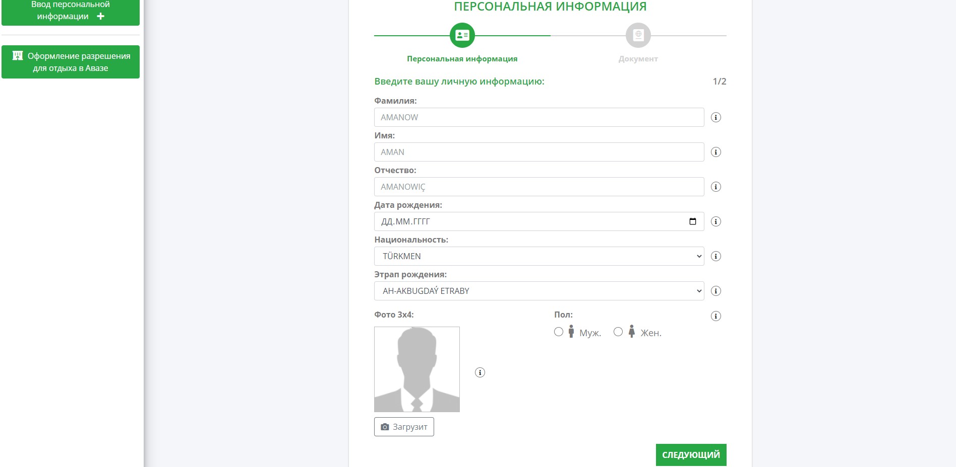 In the Personal Account, go to the “Entering personal information” section, where you need to fill in the fields in the order indicated on the site page. Here you will need to specify your full name, date and place of birth, gender, nationality and upload an electronic photo 3x4 in size.