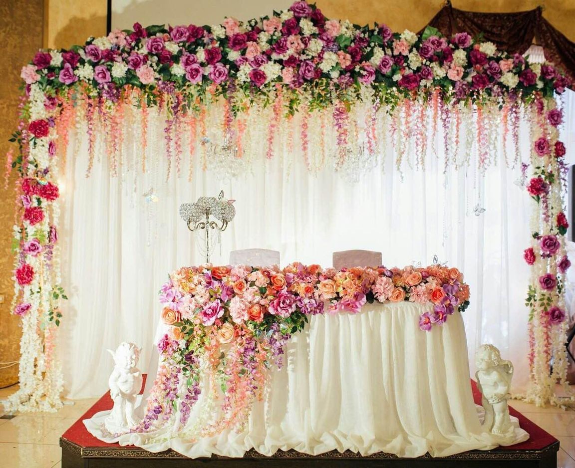 Newlyweds table. The presidium or the table of the bride and groom is the central place, its decoration should be richer than the decor of the guests’ tables.