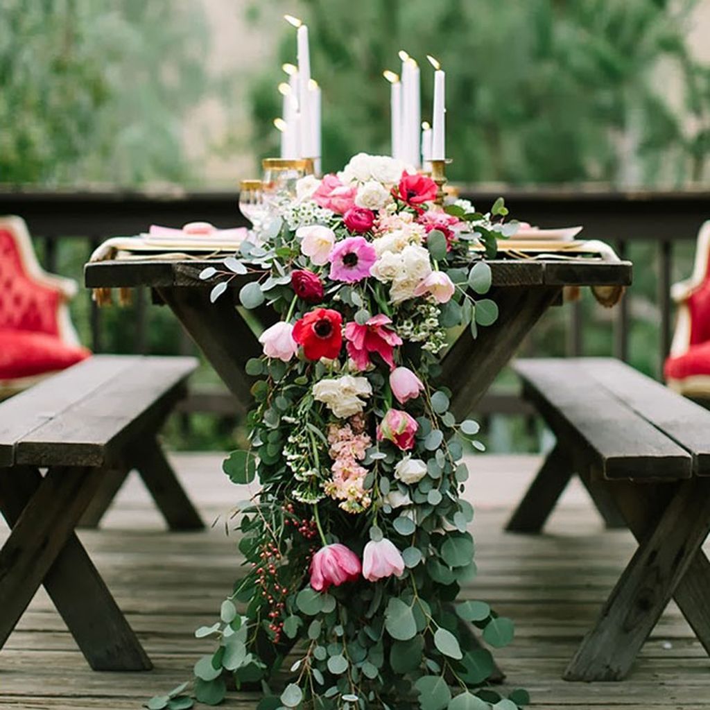 Runners on the tables. Another unusual solution in the wedding decoration is floral runners on the tables of guests. The composition can be either along the length of table or hang from it.