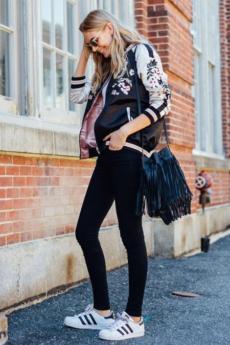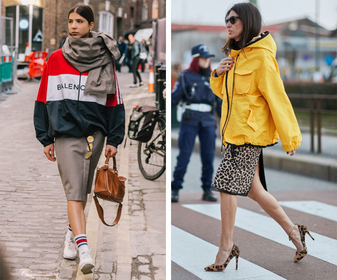 There are many stylish solutions with what to wear with a windbreaker jacket: with black leggings and sneakers, with a short A-line skirt, with wide trousers also made of nylon, with airy skirt and warm tights.