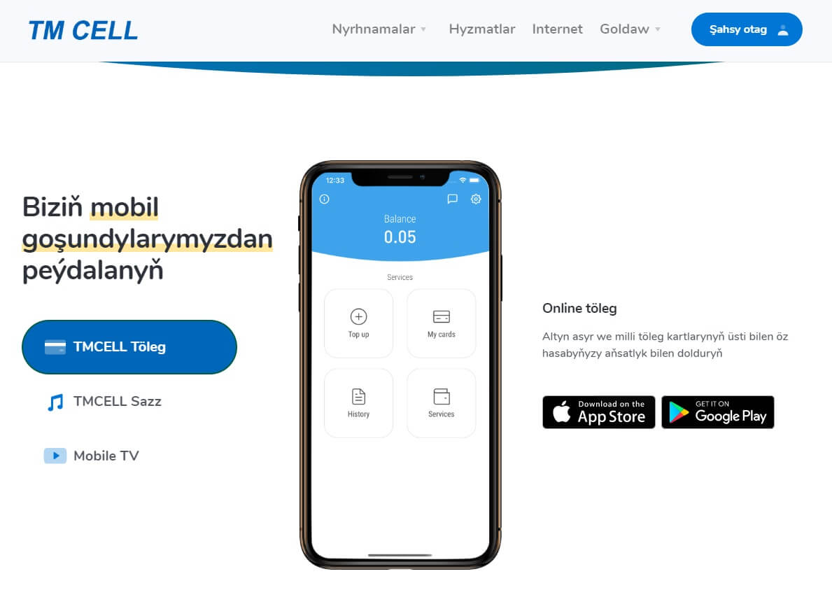 2. Would you like to top up your mobile phone account? To do this, you can use the site Tmcell.tm, the "Tmcell töleg" mobile app, the "Internet banking" and "Mobile banking" banking services.