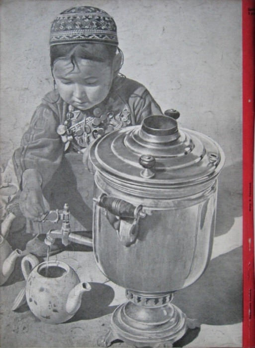 На фото девочка, лет пяти, одетая в туркменское национальное платьице, присев на корточки, с увлечением наливает чай из медного самовара. На голове девочки искусно вышитая шапочка “тахья”, на платьице, сшитой из домотканой материи “кетени”, серебренное украшение. Девочка удивительно сосредоточена, ее не пугает ни самовар с горячей водой, который очень большой для ее роста, ни тяжесть наполненного чайника, который она, скорее всего, не сможет поднять. Здесь также можно увидеть задатки очень трудолюбивого человека, ведь в этом возрасте дети обычно заняты игрушками. Но девочка уже хочет быть полезной. Очень похвальное качество. Видно, что она очень уверенно держит краник самовара, и, кажется, что это для неё привычное занятие. Милое фото невольно вызывает улыбку. Поза девочки, присевшей, чтобы наполнить чайник, сосредоточенное лицо, длинное платьице, головной убор, украшение с сердоликом, длинные рукава, капризный завиток на лбу, прямой пробор волос, ниспадающие на плечи локоны, взгляд, устремленный вниз, носок обуви, выглядывающий из-под платья, положение левой руки на колене, занятая правая рука, наличие чайника – все эти детали повторяются в образе фарфоровой статуэтки “Маленькая хозяйка”. Всё это дает основание полагать, что вероятно прототипом является именно эта девочка – туркменка, запечатлённая на черно-белой фотографии. Первые экземпляры данной статуэтки были произведены на фарфоровом заводе в 1952-м году, а номер журнала “Огонёк”, где на последней странице размещена фотография маленькой туркменской девочки, датируется 1948-м годом. Еще на одну немаловажную деталь нужно обратить внимание, на постаменте статуэтки мы видим нарисованные узоры “гёль” традиционного туркменского ковра. Отдельно хочется отметить, что у этой гармоничной статуэтки очень удачное название. “Маленькая хозяйка”… Действительно, в детстве кажется, что все взрослые заняты очень важным делом и поэтому дети стремятся подрожать им и изображать из себя то врача, то продавца, то водителя. Вот и эта увлеченная игрой девочка, изображая из себя гостеприимную хозяйку, разливает чай из своего маленького чайника и, вероятно, собирается кого-то угостить.
