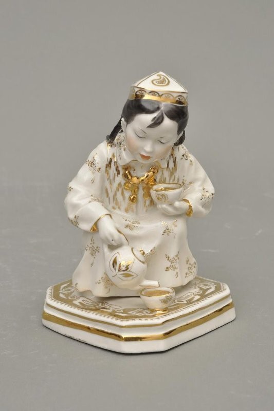 Это было несколько лет тому назад, когда я только начинала интересоваться статуэтками. На прилавках базара, где сверкали хрустали и фарфоровые фигурки, мое внимание привлекла маленькая статуэтка. Причем я сразу обратила на неё внимание, так как она была необычайно красива. Маленькая девочка, присев на корточки, наливает чай в пиалу. И что удивительно, ее взгляд был очень сосредоточен, будто она понимает каким важным делом она занимается. Я была с моей соседкой Марал и она тоже невольно залюбовалась этот прелестной статуэткой. “Она обязательно должна быть в твоей коллекции” – сказала Марал. Она знала, что я увлекаюсь историей фарфора и что у меня было несколько фарфоровых статуэток. Конечно, не купить эту старинную фигурку я не могла. Тут же узнав цену, которая, к слову, была невысокой, я приобрела её. Позднее я узнала, что эта статуэтка была произведена в 50-е годы на Дулевском фарфоровом заводе и называется “Маленькая хозяйка”.