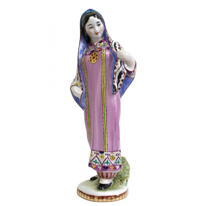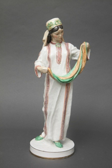 А вот еще одна изящная статуэтка работы Богдановой “Туркменская ковровщица”. 1955г. – туркменка в нарядном белом платье “кетени” держит на руках пряжу.
