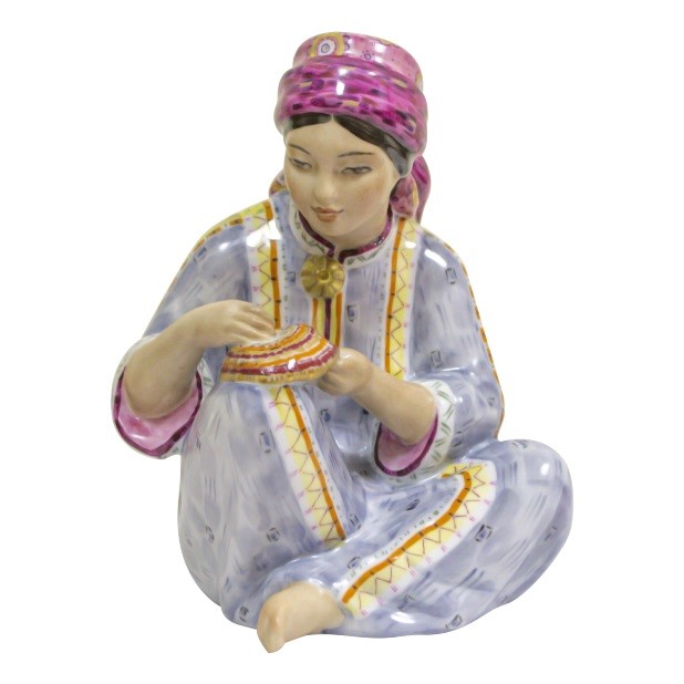 И наконец, самая интересная, на мой взгляд статуэтка, которая так и называется “Туркменка”. Миловидная туркменка в головном уборе “борук” и в необычайно красивом платье вышивает тюбетейку. Возможно, она вышивает её для любимого сынишки, а возможно для своей маленькой дочери. Ведь туркменские женщины очень трудолюбивые, они даже на досуге занимаются каким-нибудь полезным делом. Лицо выражает одновременно покой и сосредоточенность, вероятно, она уже заканчивает вышивать и осталось совсем немного.