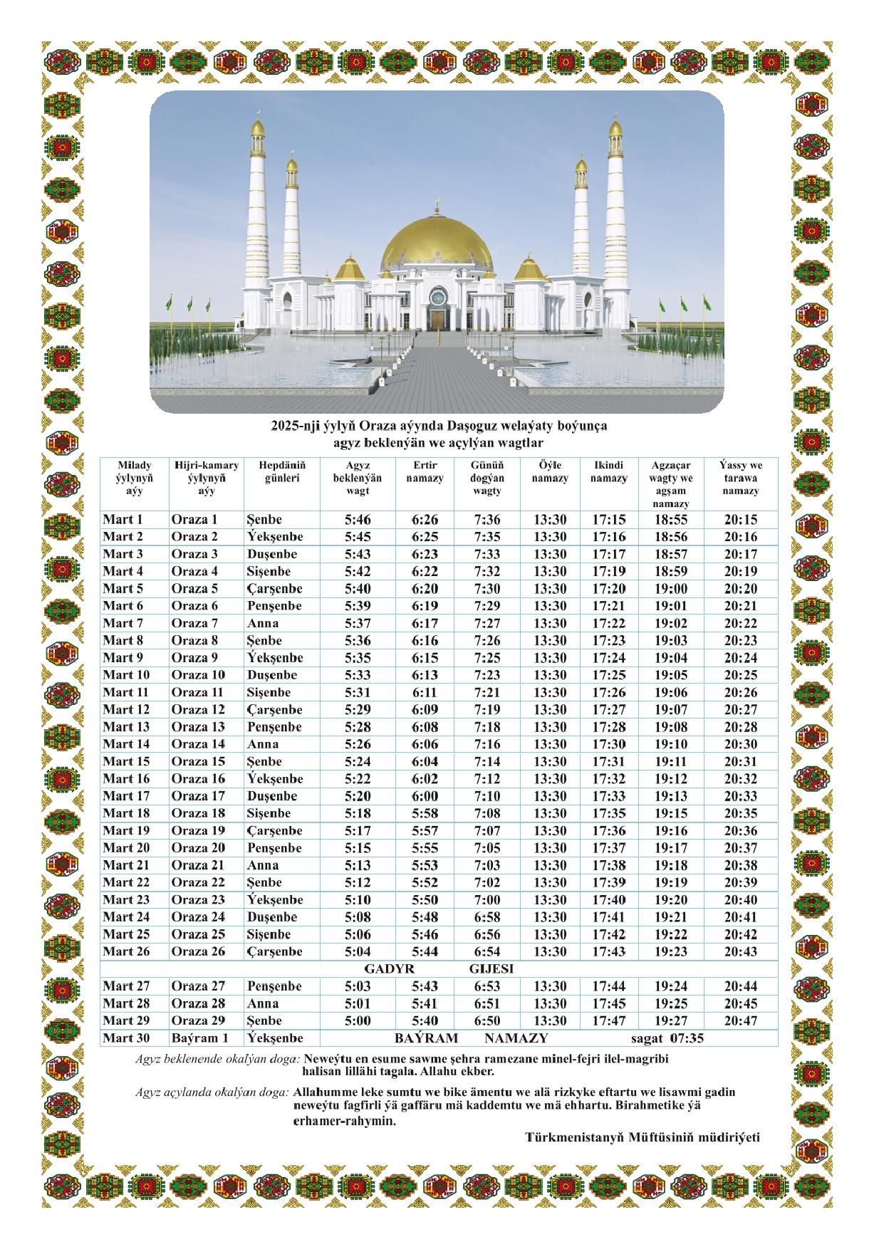 В разных регионах Туркменистана время начала и окончания поста немного отличается из-за географического расположения. В таблице выше представлено расписание для основных регионов страны.