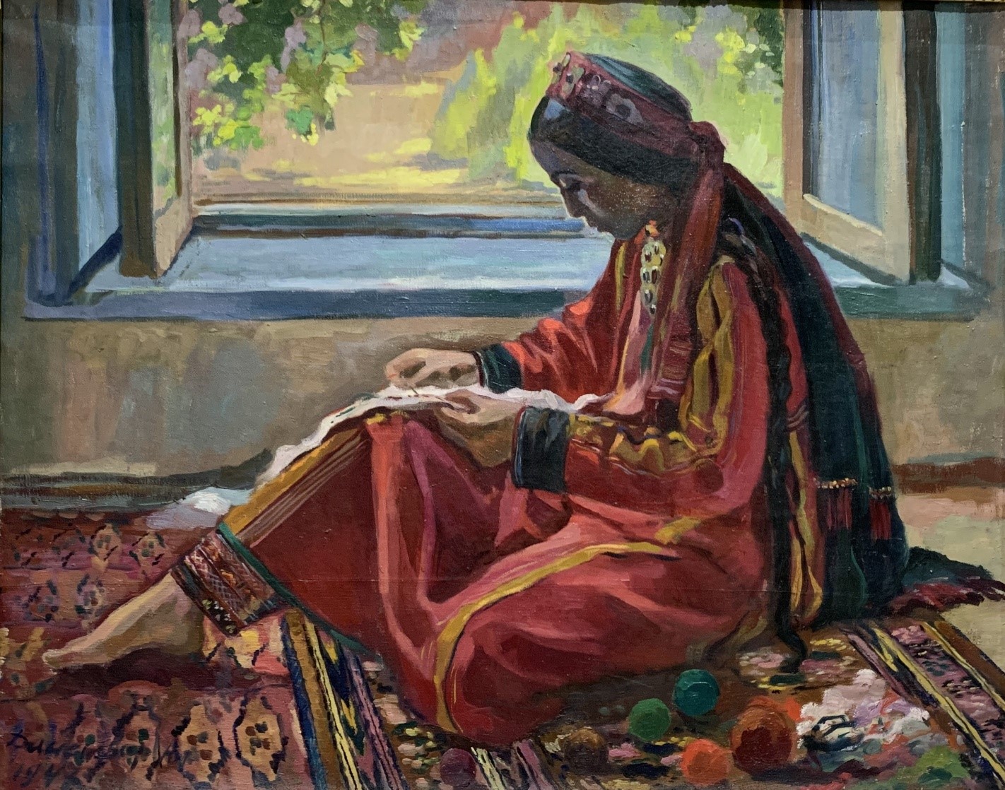 В один из ранних дней ашхабадской весны я посетила Музей изобразительных искусств Туркменистана и среди различных произведений искусства я увидела картину «За рукоделием». Эта удивительно светлая и теплая картина была написана в 1947 году талантливой художницей Юлией Прокофьевной Данешвар (1912-1948). У окна на ковре сидит молодая туркменка в красивом красном платье «кетени» и вышивает. В открытое окно мы видим цветущие деревья, скорее всего, это весна. Тени прямо под деревьями, значит изображено дневное время.