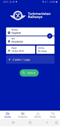 При открытии приложения, по умолчанию вы попадаете в меню «Gözleg» (Поиск). В этом меню есть поля «Nireden» (Откуда), «Nirä» (Куда), «Haçan» (Когда), «Görnüş» (Вид). Заполнив данные поля, можно произвести поиск маршрута. Например: С Ашхабада до Амударьи, 14-ого июля, в одну сторону, двое взрослых и один ребёнок. Затем нажмите кнопку «Gözle» (Поиск).
