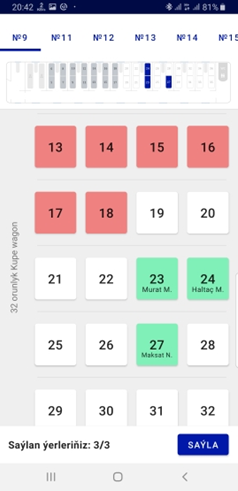 В следующих окнах выбирается место для пассажира. Сведения о пустых местах в вагоне отображаются в интерактивном виде на картинке. С помощью кнопки «Saýla» (Выбрать) можно выбрать место.